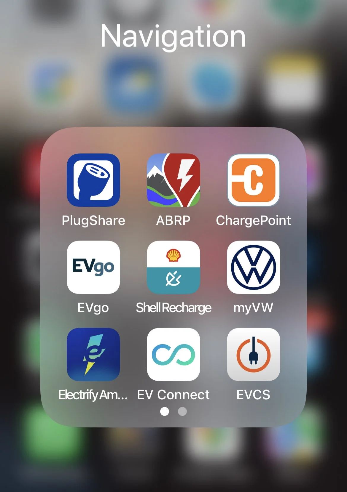 I’ll always use Electrify America first because my ID.4 comes with three years of free charging on their network. Why? Read this. Their app is an excellent way to locate charging stations along your route and determine the status of those stations: how many chargers are in working order and, of those, how many are available and not being used by others. You can even initiate a charge from the app, which is handy for when you have pulled up to one of their chargers, and the weather outside is not conducive to standing around fiddling with your iPhone, for example, raining or snowing. The app also has a great map on CarPlay, so I use that to find the next station. Then I can switch to Apple Maps for exact navigation. It even shows which corner of the Walmart parking lot to navigate to. Usually, the one over there in Siberia.